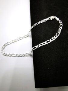 Figaro zincir erkek gümüş bileklik modellerinde kısa halkalar ve uzun halkalar belirli bir düzen içinde sıralanır. Bu tasarım bilekliğe güçlü ve estetik bir görünüm kazandırır.